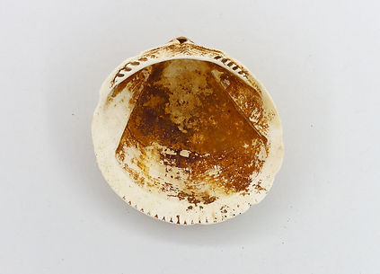 This shell, a valve of which is shown in external view (upper image) and internal view (lower image), is identifiable from its match to Kirkaldy (1972: Plate 101) and Lee et al. (2015: Plate 15). Loose valves of this species are very common fossils of the Red Crag, which lends them their characteristic rusty red stain. The species (the Dog Cockle) is still extant, the Red Crag being a relatively young formation. [F_117]